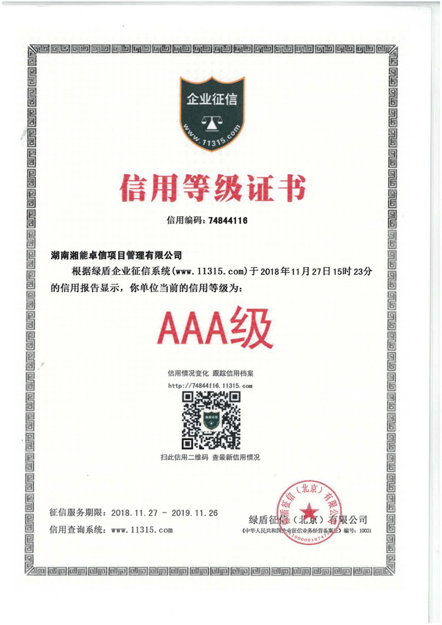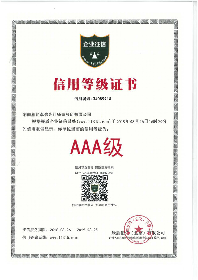 近日,湖南湘能卓信項(xiàng)目管理有限公司及湖南湘能卓信會(huì)計(jì)師事務(wù)所有限公司獲得了由綠盾企業(yè)征信系統(tǒng)出具的企業(yè)征信信用等級(jí)“AAA”證書。