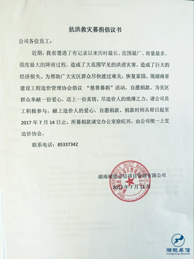 2017年7月10日湖南省建設(shè)工程造價管理協(xié)會組織開展抗洪救災(zāi)“慈善募捐”活動。我單位積極響應(yīng)發(fā)出倡議,募得捐款共:5470元,已如數(shù)上交湖南省工程造價管理協(xié)會。